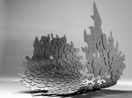 The project is a spacious intervention. The public building has an organic form and structure where the floor and walls fully and seamlessly merge. It has been constructed with 2500 manually written flakes, each one's shape unique. Many small flakes together forming a large structure that looks like an animal skin or some natural mountain relief. It is a final project after learning 3D modelling software Rhinoceros.